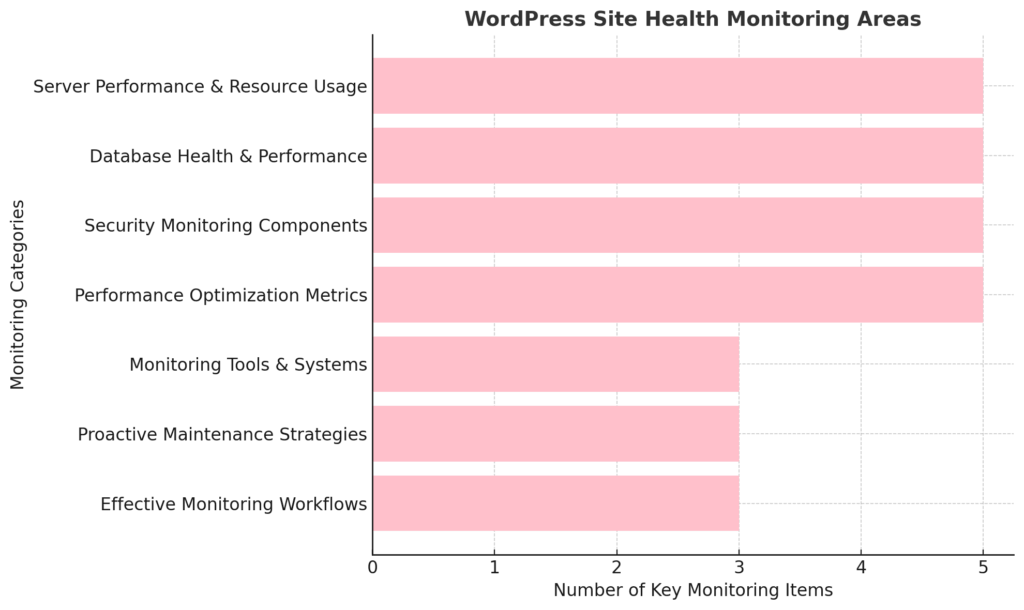 Die Überwachungslandschaft hebt wichtige Kategorien hervor, die Hosting-Anbieter verfolgen sollten, um die Gesundheit der WordPress-Website zu erhalten. Es legt den Schwerpunkt auf Serverleistung, Datenbankstabilität, Sicherheitskomponenten und Leistungsoptimierung, die alle Geschwindigkeit, Zuverlässigkeit und Schwachstellenschutz beeinflussen können. Es unterstreicht auch die Bedeutung von Überwachungstools, proaktiver Wartung und strukturierten Arbeitsabläufen, die helfen, Probleme frühzeitig zu erkennen und konsistent zu bearbeiten. Zusammen bieten diese Bereiche einen umfassenden Rahmen, um WordPress-Seiten langfristig sicher, effizient und widerstandsfähig zu halten.